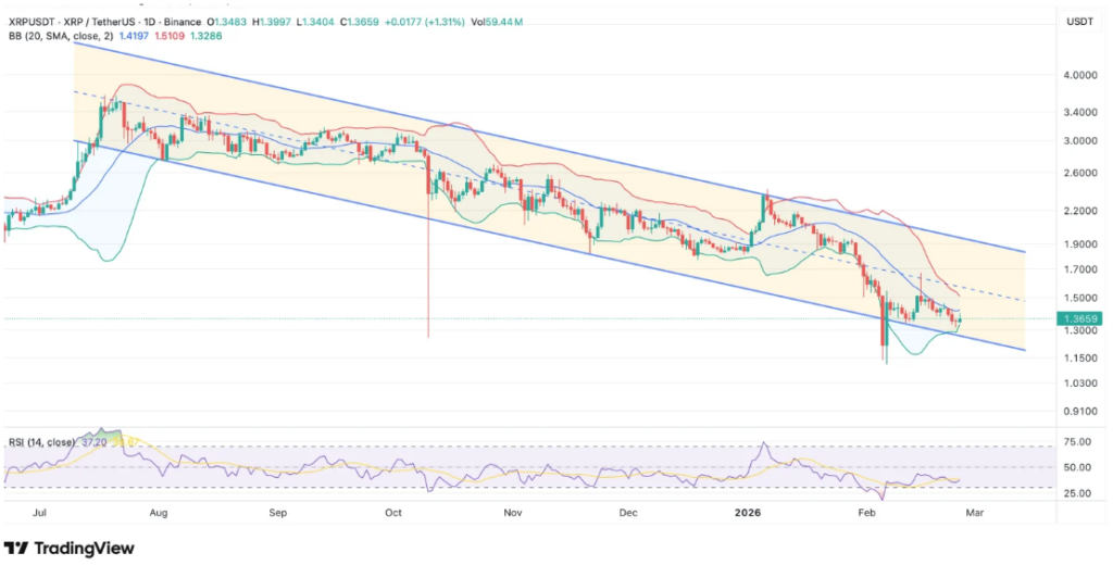 Miután az XRP 2025-ben 3 dollár fölött tetőzött, a trend egy csökkenő csatornában ragadt.