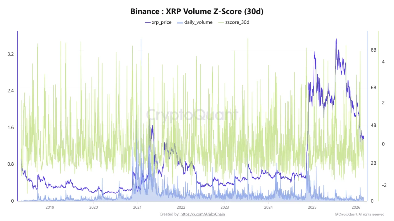 Az XRP jelenleg 1,34 dollár körül kereskedik, ami több mint 63%-kal alacsonyabb, mint a 2025 júliusában elért 3,65 dolláros történelmi csúcs.