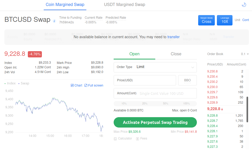 A perpetual swapok mögöttes eszközeként választhatunk kriptopénzeket, de USDT stabilcoint is. Ezek között a Coin Margined Swap és a USDT Margined Swap gombokkal válthatunk.