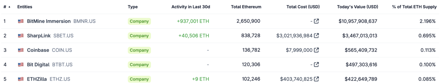 A listát a BitMine Immersion Technologies vezeti, amelynek tartalékai meghaladják a 10,5 milliárd dollárt.