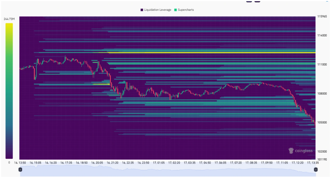 A térképen sűrű likvidációs zónák láthatók 109.000 és 105.000 dollár között — ezek azok a területek, ahol a tőkeáttétes pozíciók kényszerzárása elindulhat.