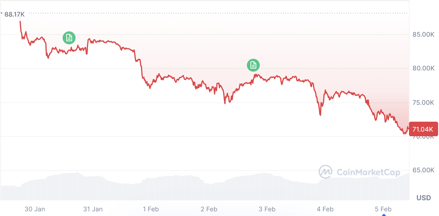 A korrekció során a BTC az 2025 áprilisi mélypontok és a 73.000 dolláros támasz alá esett, egészen 69.830 dollárig, mielőtt visszakapaszkodott volna 70.000 dollár fölé.