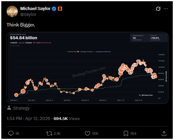 Michael Saylor április 12-én közzétette a Strategy bitcoin-vásárlási tervét az X-en, mellé egyetlen felirattal: „Think bigger.”