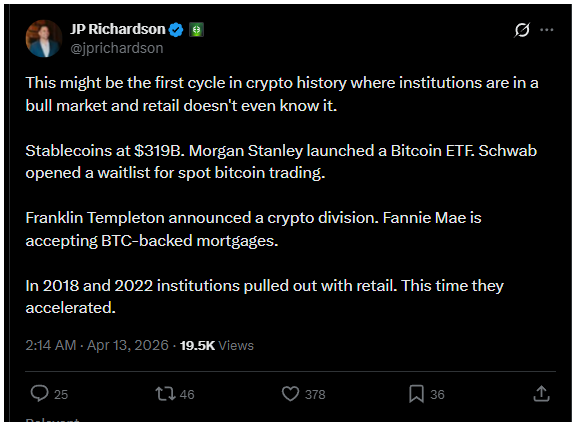 Az Exodus tárca vezérigazgatója, JP Richardson szerint ez a ciklus alapvetően különbözik az összes korábbitól. 2018-ban és 2022-ben az intézmények a kisbefektetőkkel együtt vonultak ki a piacról.