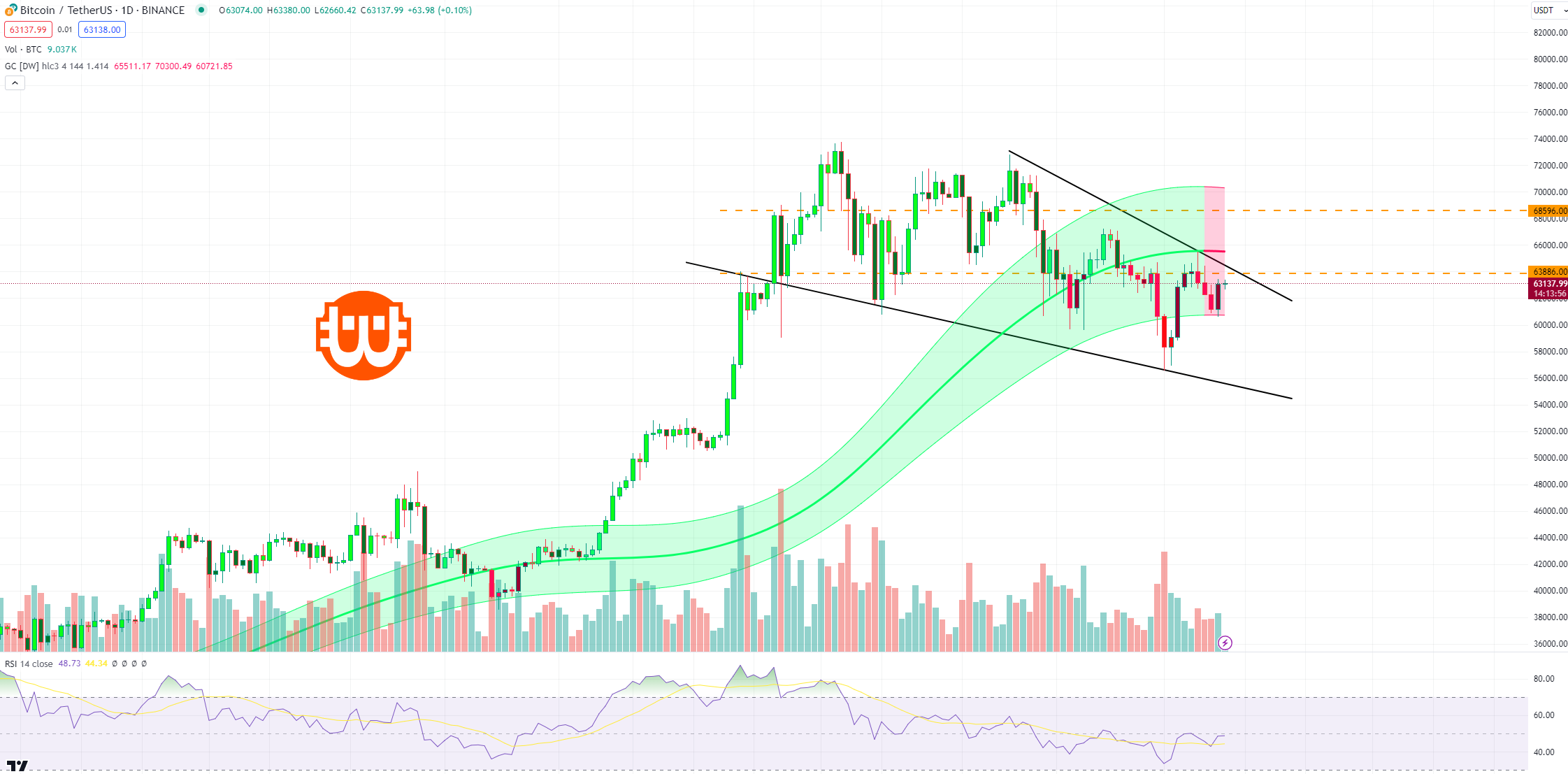 Amint fentebb már említettem, a Bitcoin árfolyama egy csökkenő éken belül kereskedik, és most, hogy a piaci szereplők a felső ellenállásból való kitörést várják, egy medvés visszautasítás is utat törhet magának.