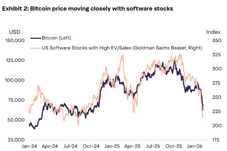 Ehelyett a bitcoin egyre szorosabban együtt mozgott a részvénypiac egyik legérzékenyebb szegmensével: a szoftvercégekkel.