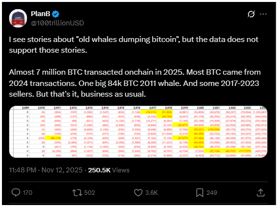 Csakhogy az ismert elemző, PlanB szerint a mostani eladások valójában nem a régi bálnáktól jönnek, hanem azoktól, akik 2024 elején vásároltak 60–70 ezer dollár közötti árfolyamon.