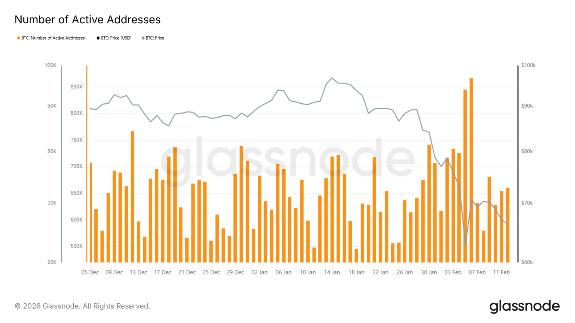 A fenti Glassnode grafikon is jól mutatja ezt az egyensúlytalanságot: az aktív címek száma növekszik, miközben a BTC árfolyama a 60.000 dolláros tartomány közepére csúszik vissza.
