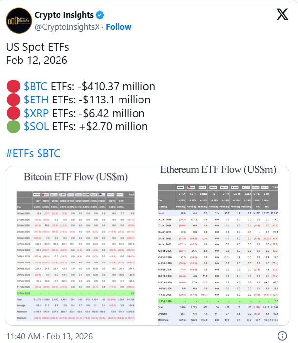 2026. február 13-án a Bitcoin árfolyammozgása ismét kockázat alá került, mivel a friss statisztikák tartós intézményi kiáramlási mintázatot és csökkenő on-chain aktivitást jeleznek.