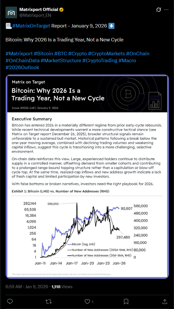 A Matrixport például kijelentette, hogy a bitcoin 2026-os kilátásai inkább taktikai kereskedésről szólnak, nem pedig egy új ciklusról.