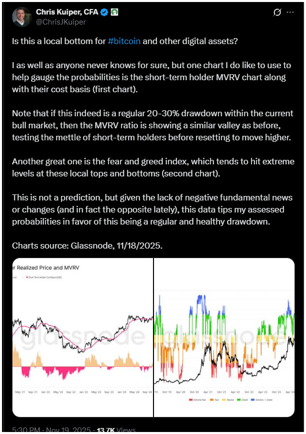 Úgy fogalmazott: a jelenlegi MVRV-mutató olyan mélyre süllyedt, mint a múltbeli 20–30 százalékos korrekciók aljánál, ahol a piac rendszerint újra erőre kapott.