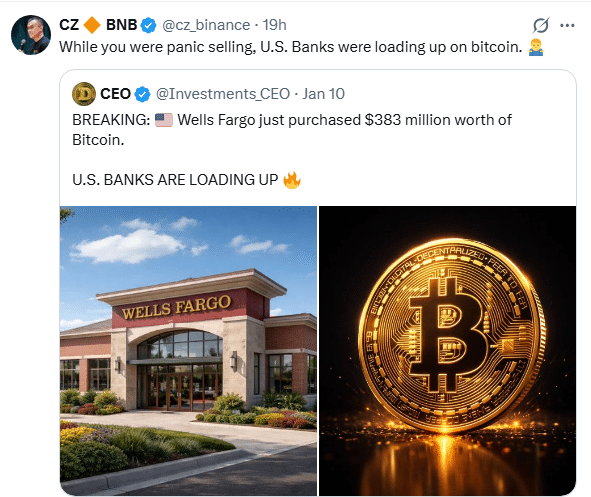 CZ újraosztotta a hírt, és kiemelte, hogy miközben a kisbefektetők eladnak, az olyan intézmények, mint a Wells Fargo, bitcoint vásárolnak.