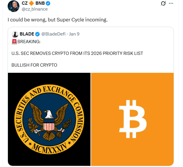 Emellett CZ azt a tényt, hogy kizárták a kriptót az amerikai SEC 2026-os kockázati listájáról, pozitív jelnek látta, és megerősítette benne a hitet, hogy bitcoin egy szuperciklusba lép.
