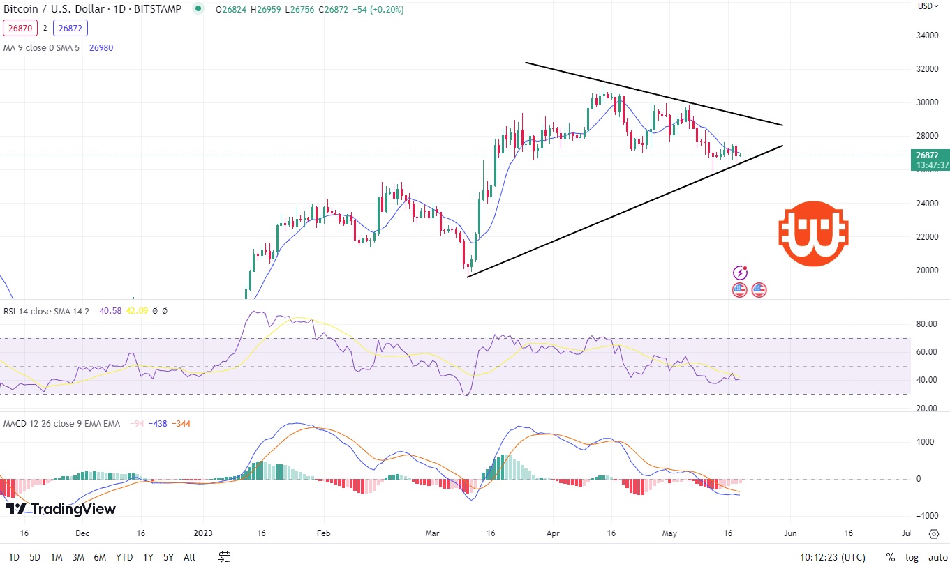 A BTC/USD páros közvetlen támaszszinttel néz szembe a 26.600 dollárnál, és az e pont alatti áttörés potenciálisan a 26.200 dollár felé történő csökkenéshez vezethet.