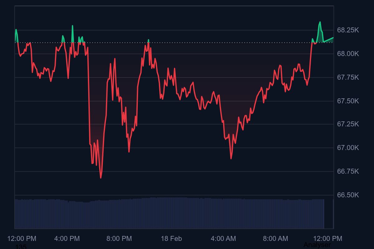 A cikk írásakor a Bitcoin árfolyama körülbelül 68.200 dollár. A 24 órás visszaesés első pillantásra mérsékeltnek tűnhet.