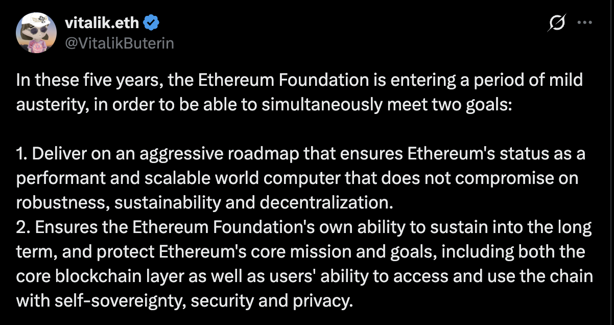 Az Ethereum Alapítvány egy több évre szóló megszorítási programot jelentett be, amelynek célja a fejlesztési prioritások és a hosszú távú pénzügyi fenntarthatóság egyensúlyba hozása – derül ki Vitalik Buterin, társalapító nyilvános közleményéből.