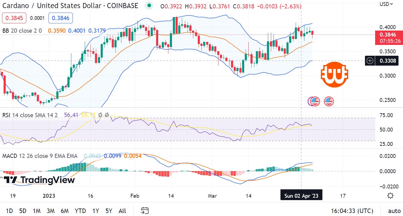 A Cardano 2,09%-ot esett az elmúlt nap során, mivel 0,3826 dollár körül kereskedik.