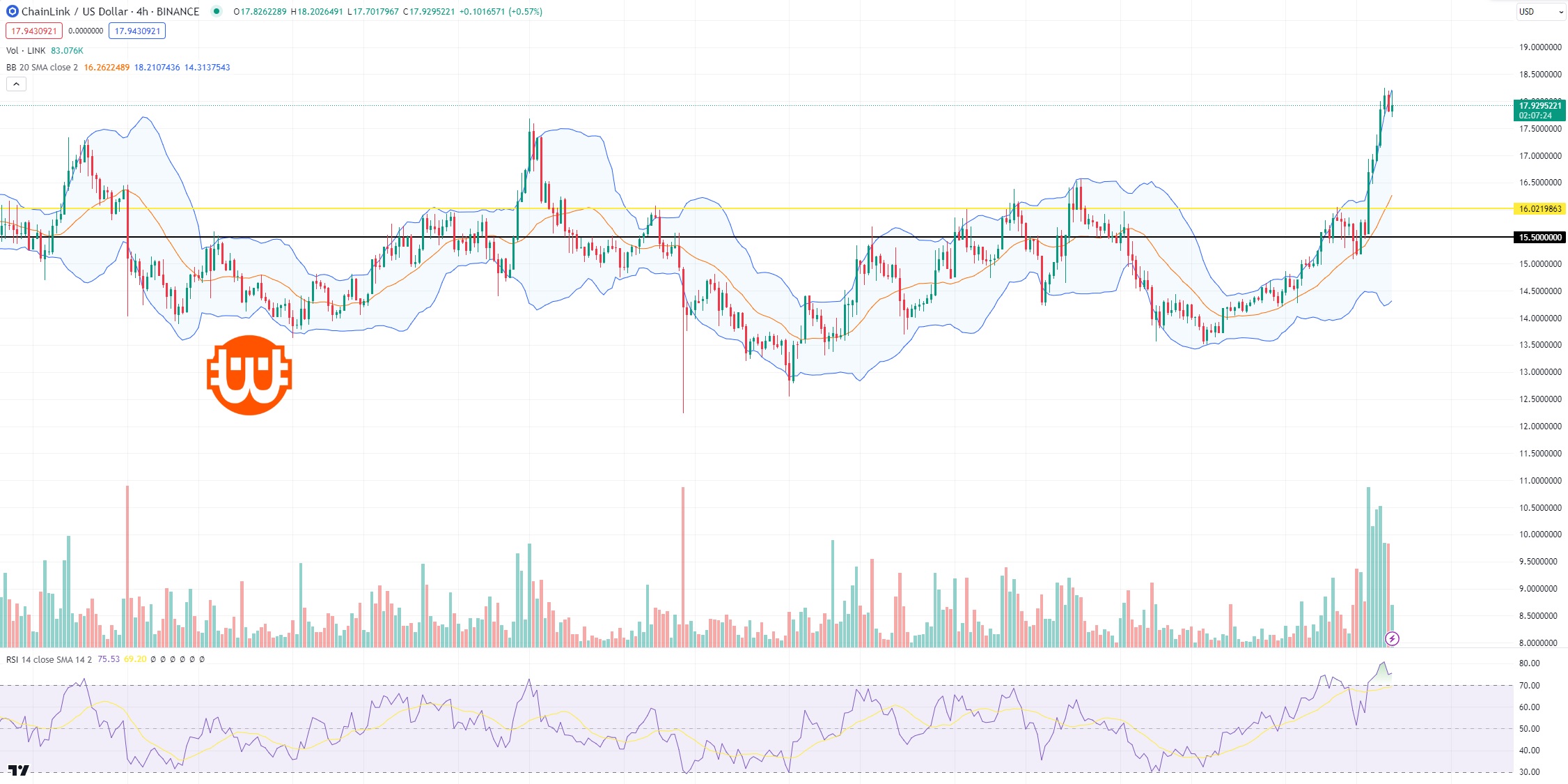 Ennek oka az volt, hogy a BB felső sávja megérintette a LINK árfolyamát 18 dollárnál. Bár a volatilitás növekedett, a LINK elkezdett visszahúzódni, mivel az árfolyam 17,75 dollárra csökkent.
