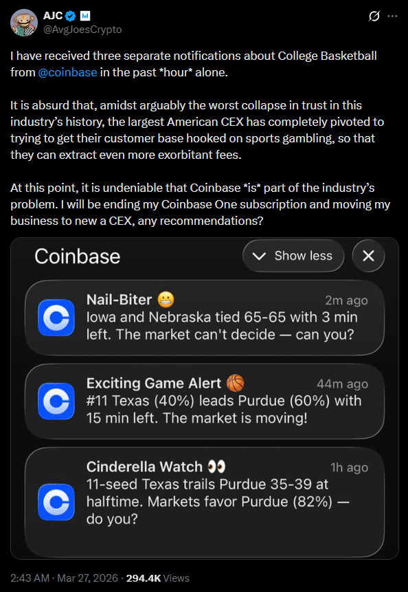 Több felhasználó is arról számolt be, hogy rövid időn belül több értesítést kapott a Coinbase alkalmazástól sporteseményekkel kapcsolatban.