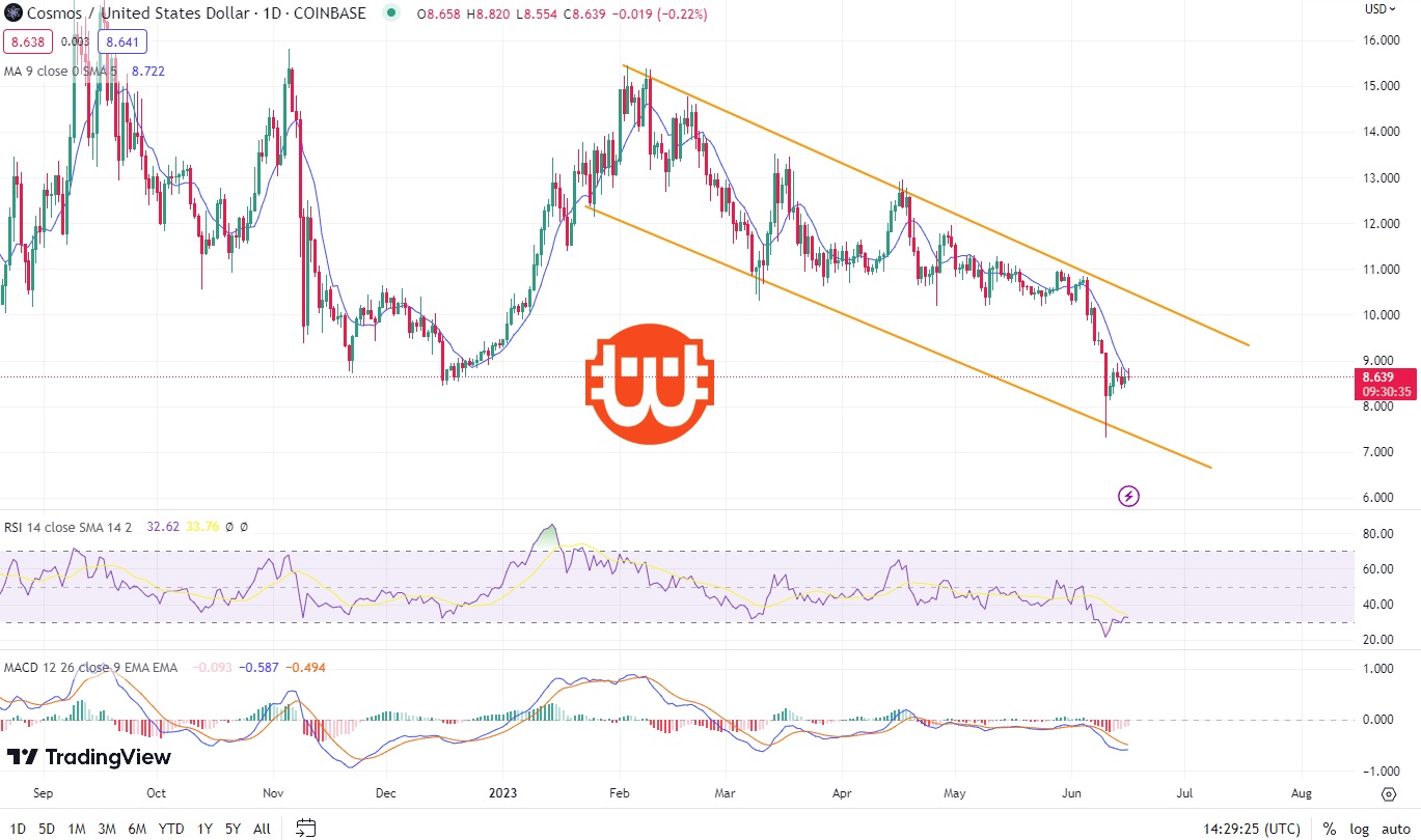 A bikáknak át kell törniük ezt a tartományt, és 9 dollár fölé kell tolniuk az árakat a további emelkedési potenciál érdekében. A kozmosz árfolyam megrekedt a 8,65 dollár közelében, ahol konszolidációra kerülhet sor.