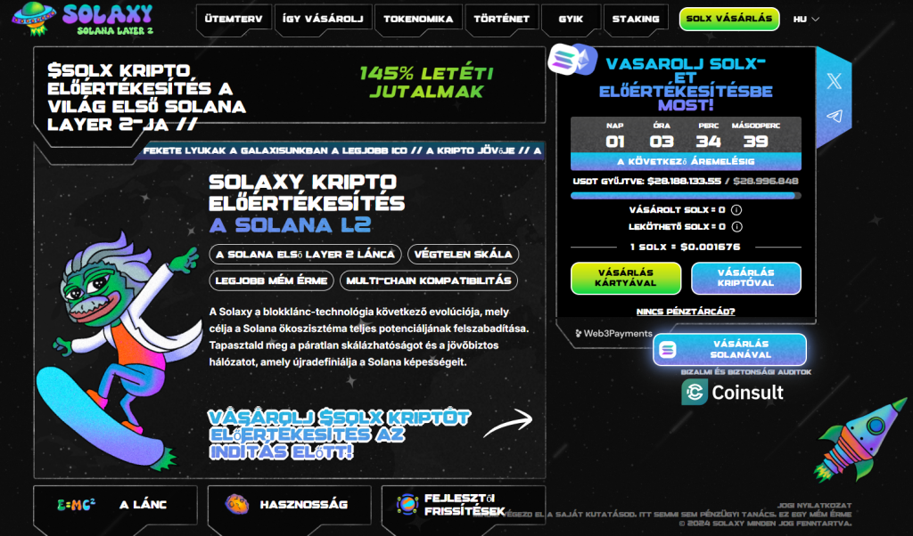 Vegyél részt te is az ICO-n! Elsőként keresd fel a Solaxy hivatalos honlapját, ahol BNB, ETH, vagy USDT kriptóval, illetve bankkártyával vehetsz SOLX érméket darabonként 0,001676 dollárért. A natív érmét a Best Wallet kriptotárca Upcoming tokens szekciójában is megvásárolhatod.