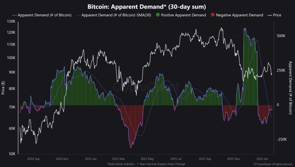 A CryptoQuant adatai szerint a Bitcoin 30 napos „apparent demand” mutatója mélyen negatív tartományba csúszott, nagyjából 60–80 ezer BTC közötti hiányt jelezve.