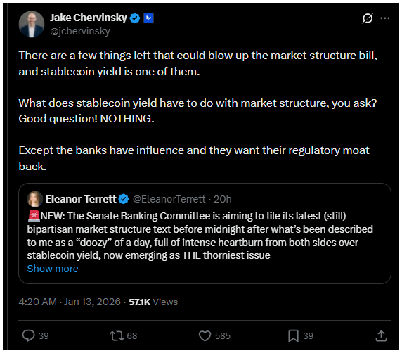 Több iparági szereplő szerint ez az egyik legérzékenyebb pontja az egész csomagnak, és akár a teljes CLARITY Act kriptotörvény sorsát is veszélybe sodorhatja.