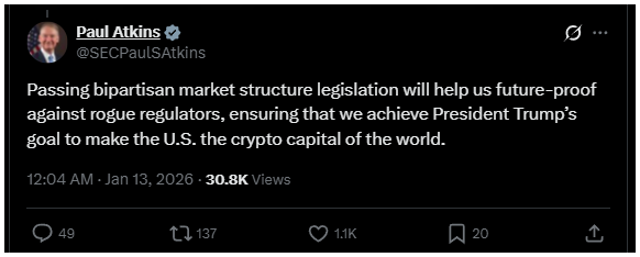 Paul Atkins, az SEC elnöke szerint a CLARITY Act kriptotörvény „jövőbiztossá” tenné a szabályozást, és segítene abban, hogy az USA valóban kriptoközponttá váljon.