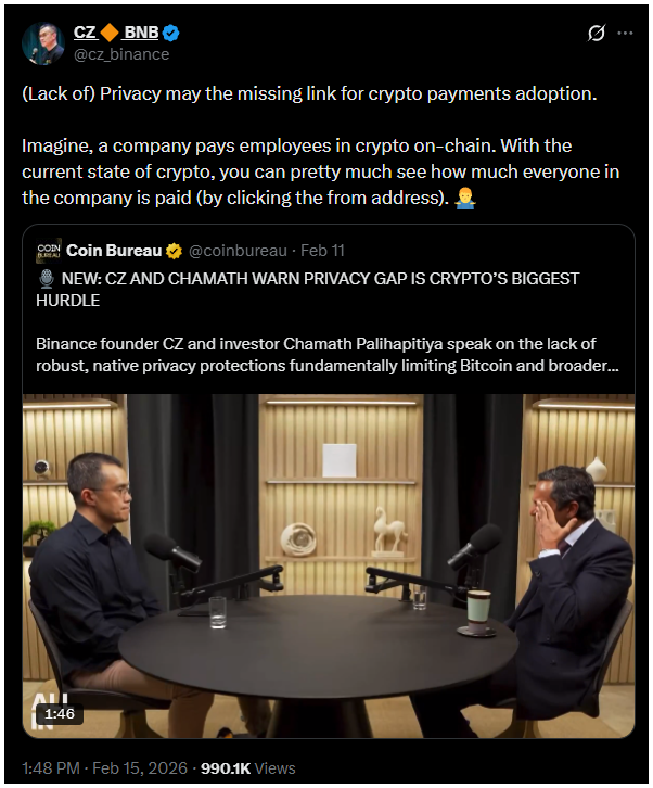 CZ szerint a jelenlegi onchain rendszer túl sokat mutat. Ha egy cég kriptóban fizeti ki az alkalmazottait, gyakorlatilag bárki megnézheti, ki mennyit keres, pusztán a „from” címre kattintva.