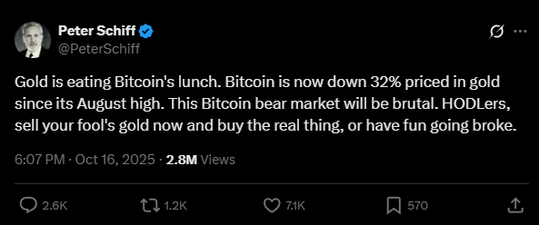 A jól ismert Bitcoin-kritikus Peter Schiff az X-en azt írta, hogy a Bitcoin augusztus óta 32%-ot veszített értékéből az aranyhoz képest, ami szerinte a befektetői bizalom gyengülését mutatja.