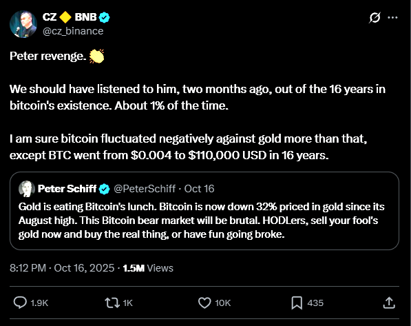 CZ visszavág Peter Schiffnek: „Ez csak 1% a Bitcoin történetéből”