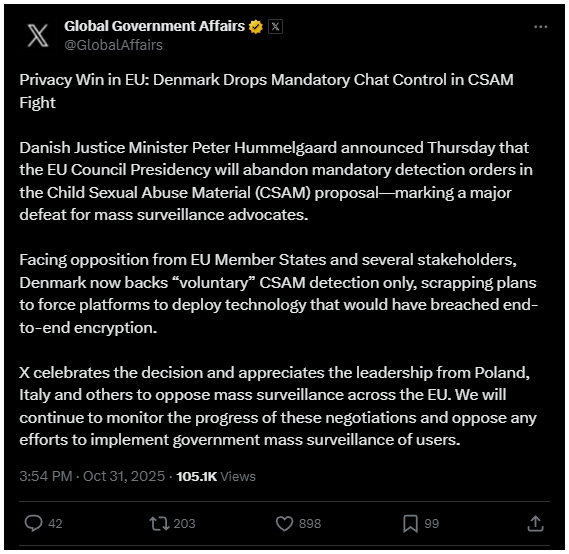 2025-ben a javaslat újra előkerült, de Dánia október 30-án végül visszalépett, ezzel megszüntetve a kötelező üzenetszkennelési törekvést.