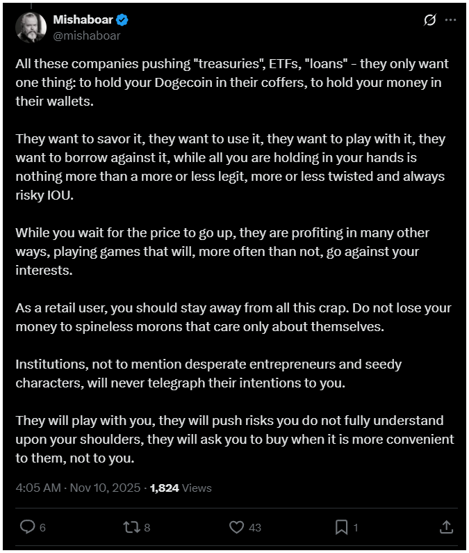 A fejlesztő szerint egyes központosított szereplők a Dogecoin nevével próbálnak pénzügyi termékeket – például Dogecoin-treasuryket, ETF-eket vagy hitelprogramokat – reklámozni.
