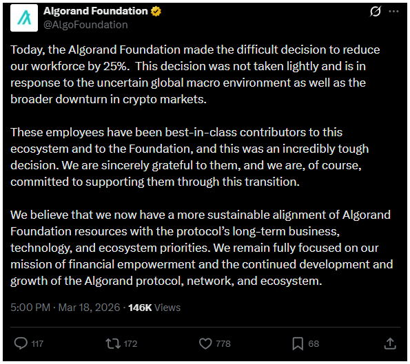 A trend nem egyedi jelenség. Március 18-án az Algorand Alapítvány megerősítette, hogy 25%-kal csökkenti a munkaerejét. Indoklásuk szerint a makrogazdasági bizonytalanság és a kriptopiac gyengesége miatt döntöttek így.