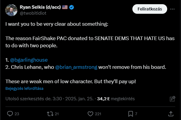 „A Ripple aláássa az amerikai jólétet, a szabadságot és a bitcoint. A Ripple aktívan lobbizik, hogy megakadályozza a bitcoin stratégiai tartalékolását az Egyesült Államokban, miközben a központosított, vállalati irányítású tokenjüket erőlteti. Ezt nem fogjuk eltűrni.”