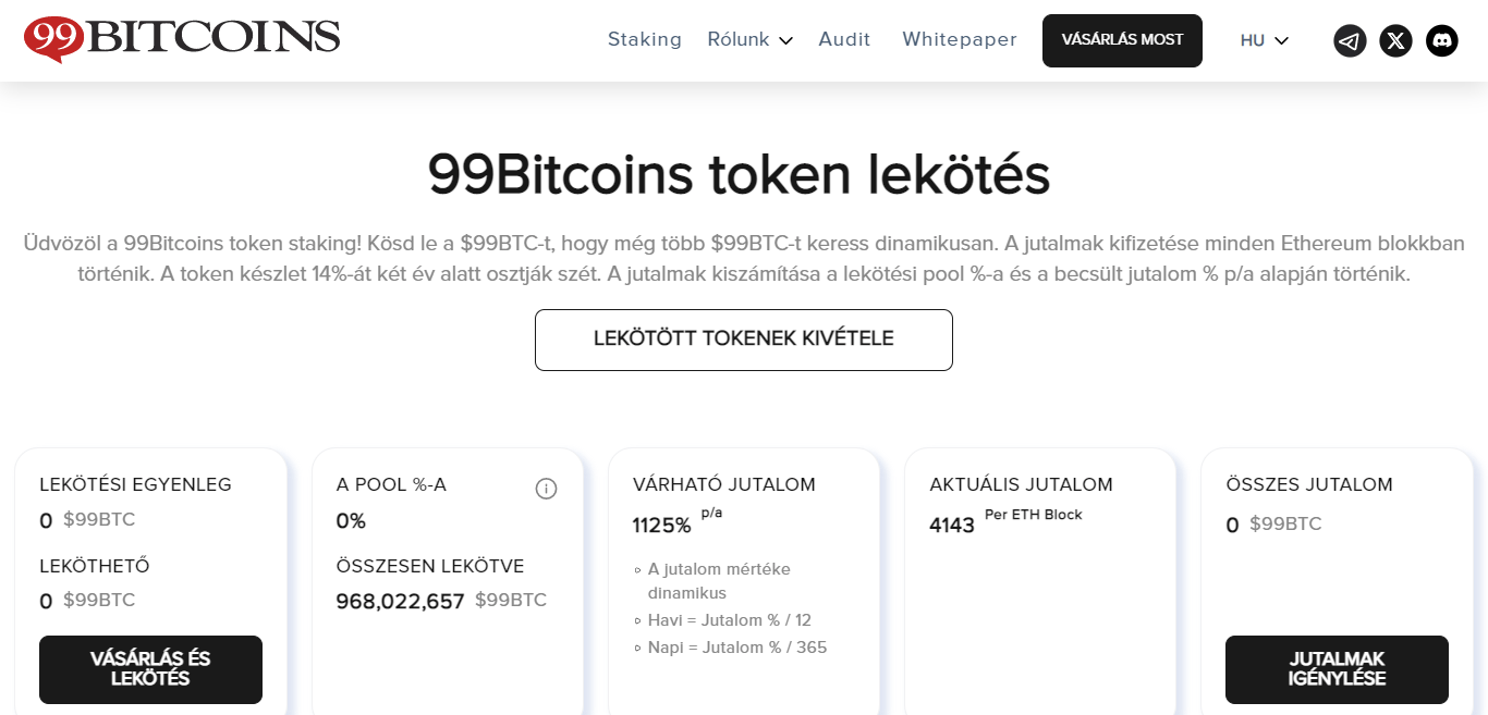 A 99Bitcoins megvásárlásához és az érmék lekötéséhez csak annyit kell tenned, hogy csatlakoztatod a pénztárcád az előértékesítési widgethez, bevásárolsz a 99BTC-ből, majd rögtön stakeled.