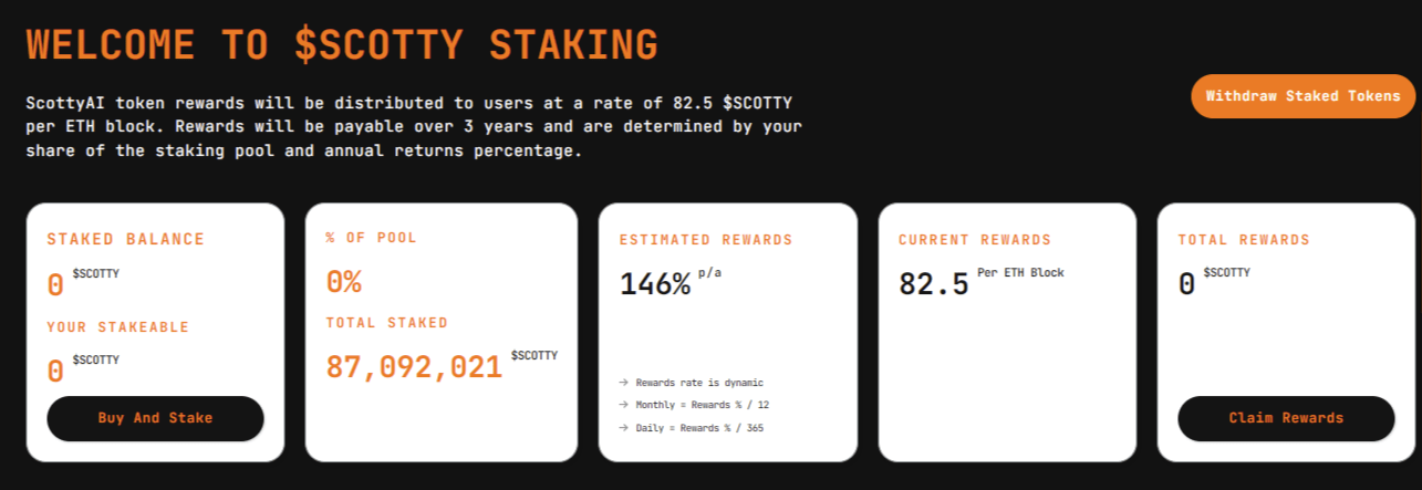 További 20%-ot a staking jutalmakra tették félre, melyeket 3 év alatt osztanak majd ki. Mértékét a lekötött tokenek száma és az éves jutalom mérete befolyásolja. A jelenlegi APY 146%, és mintegy 87,092,021 SCOTTY-t stakeltek már. Az aktuális blokkjutalom 82.5.