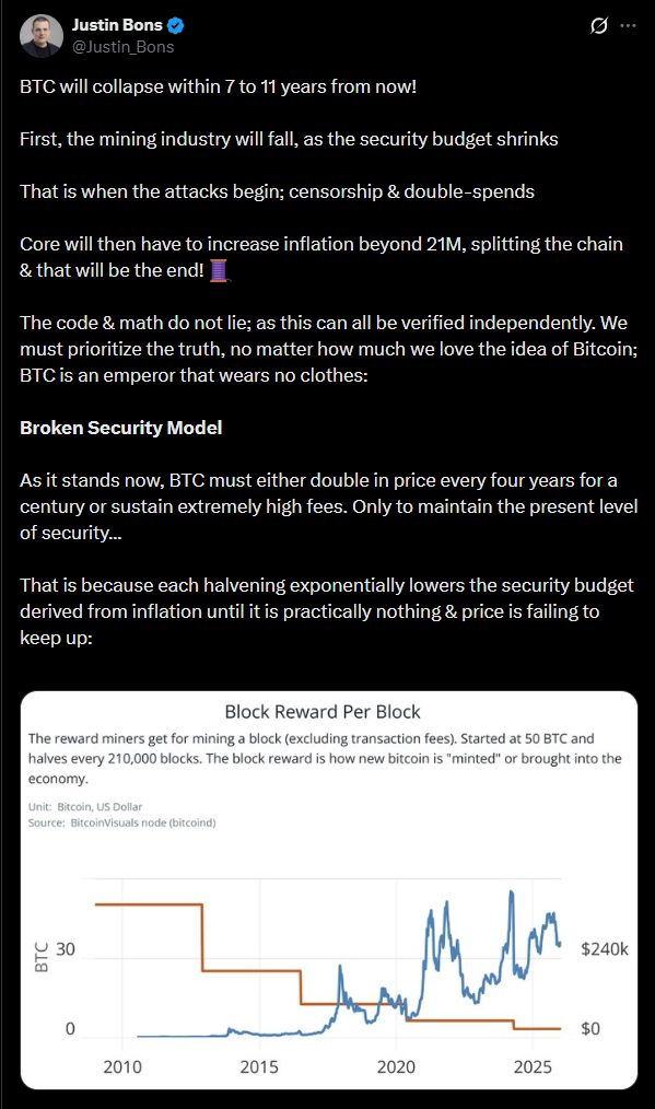 Justin Bons kriptoelemző szerint a Bitcoin jelenlegi gazdasági és technikai modellje 7–11 éven belül komoly biztonsági problémákba futhat, méghozzá nem érzelmi alapon, hanem hideg matematikával alátámasztva.