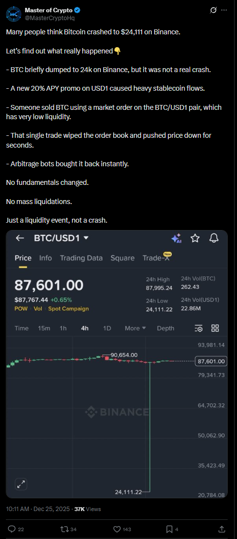 A jelentett „összeomlás” kizárólag a Binance BTC/USD1 párján történt, ahol alig van kereskedés.