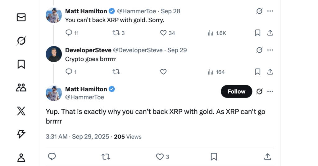 „Az XRP nem ‘megy brrrr’” — mondta Hamilton, utalva a fiatpénzek vagy algoritmikus stablecoinok korlátlan nyomtatására.