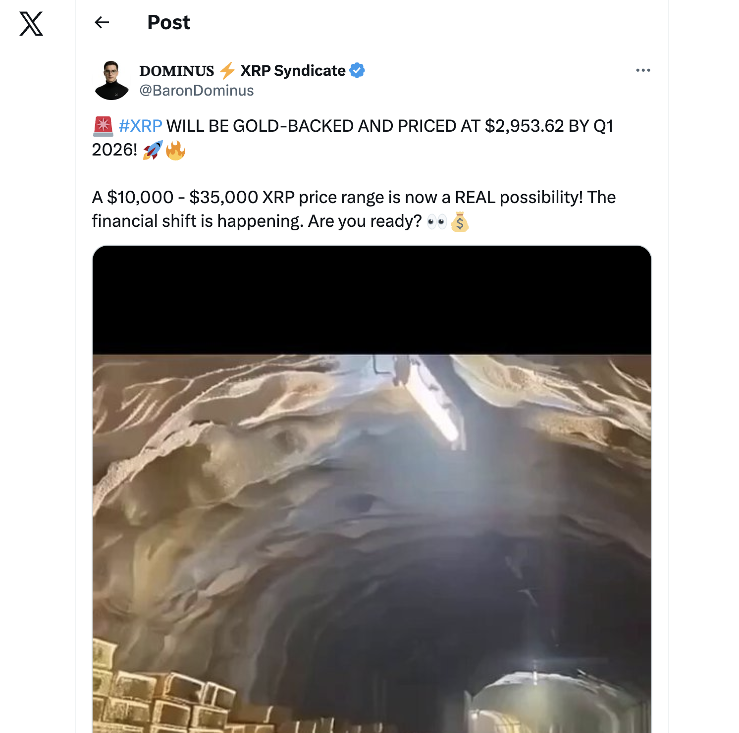 Dominus azt állította, hogy az XRP-t hamarosan arany fogja fedezni, és ez a lépés akár 2953 dollárra is emelheti a token értékét 2026 elejéig.