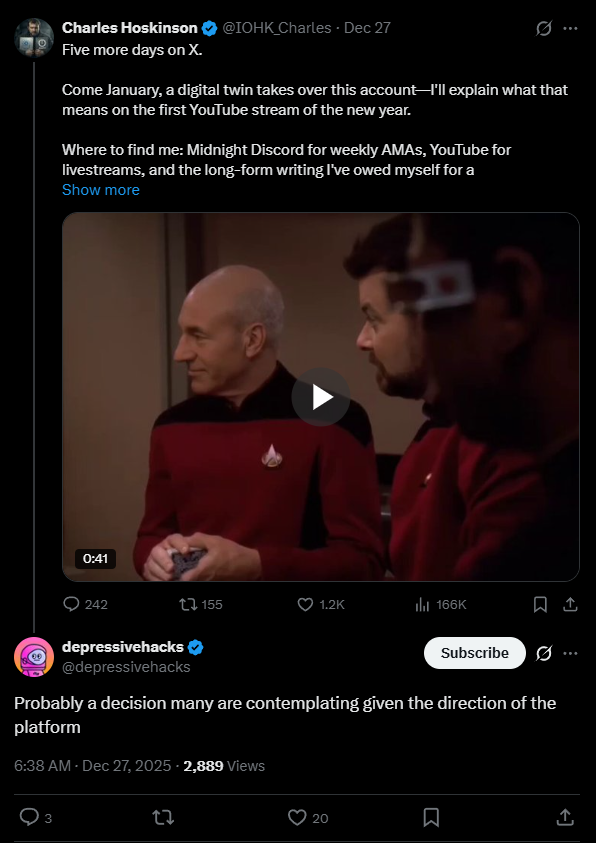 Charles Hoskinson, az IOHK vezetője szerint az X rossz irányba halad. Bejelentette, hogy kevesebb mint egy héten belül elhagyja a platformot, és egy „digitális hasonmás” veszi át a fiókját.