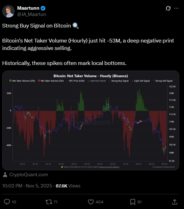 Mióta a bitcoin ára 100.000 dollár alá csúszott, az on-chain adatok új keresletet mutatnak. A kereskedők kihasználják az áresést.