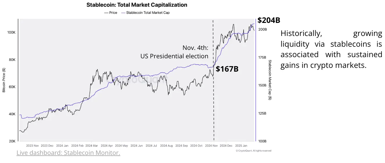 A Cryptoquant elemzői arról számoltak be, hogy az USD-hez kötött szilmék (stablecoinok) teljes piaci kapitalizációja a múlt héten először haladta meg a 200 milliárd dollárt, és 204 milliárd dollárra emelkedett – ez 37 milliárd dolláros növekedés 2024. november 4. óta.