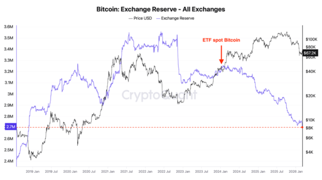 A blokklánc-adatok szerint a tőzsdéken tartott Bitcoin mennyisége hatéves mélypontra esett, ami alapvetően átalakíthatja a piac kínálati szerkezetét.