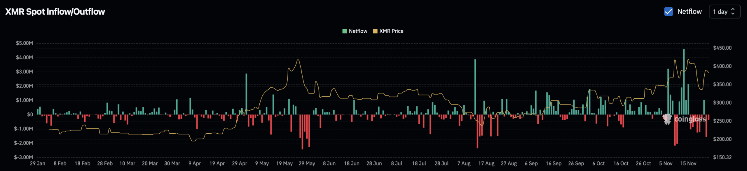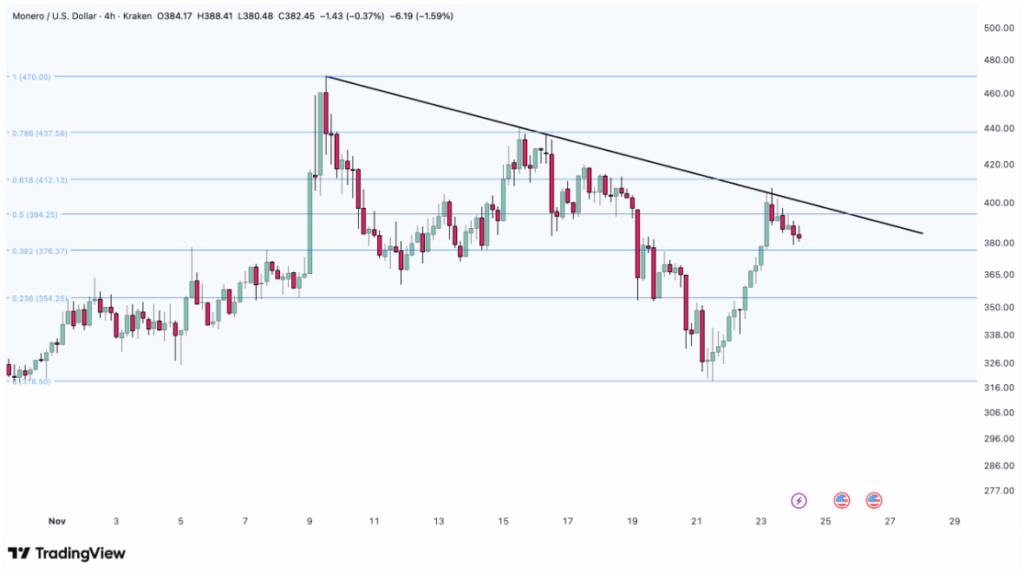 A cikk írásakor az XMR a 0,5-ös Fibonacci korrekció közelében mozgott, 394,25 dollárnál. Ez a szint rövid távon keresletet hozhat.