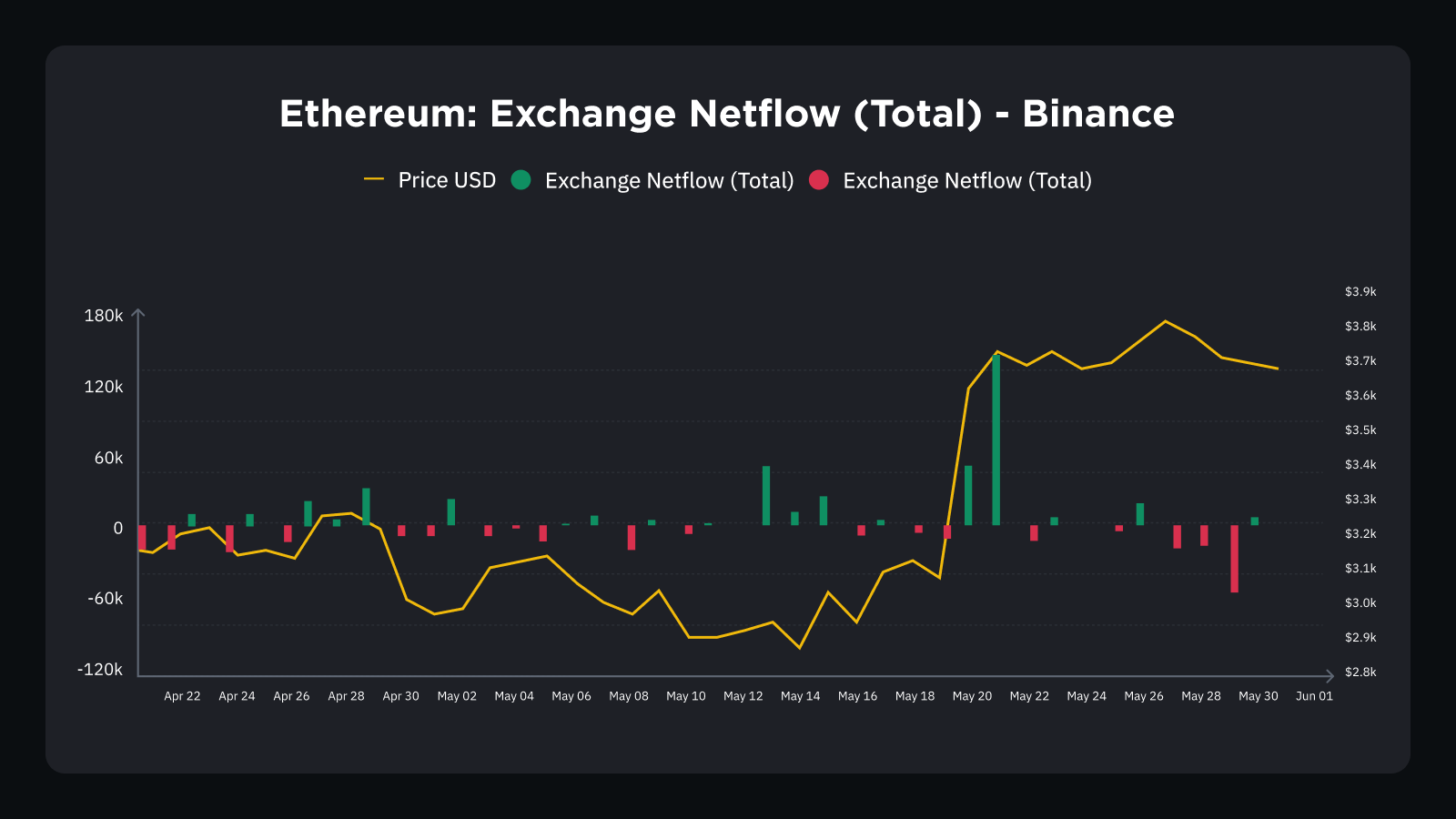 Ugyancsak jelentős volt az Ethereum beáramlása a Binance-re ebben az időszakban. Május 21-én, a Binance platformjára nettó 145,777 ETH érkezett, ami 2023 májusa óta a legmagasabb érték, és a következő napokban is erőteljes maradt a beáramlás.