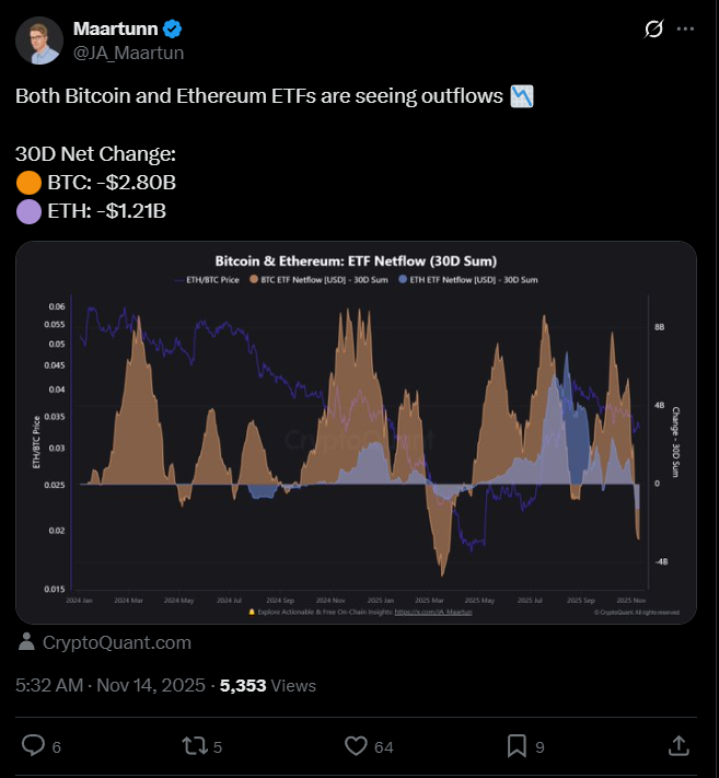 A CryptoQuant elemzője, Maartunn szerint ez egyértelműen negatív teljes piacra nézve, és erősíti az esélyét egy jelentősebb lejtmenetnek.