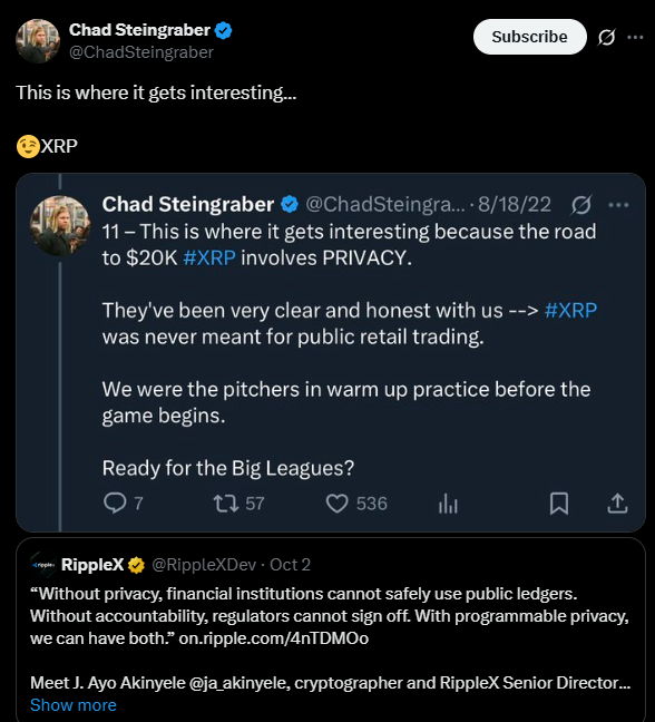 Az adatvédelem iránti növekvő érdeklődés újra előhozta egy korábbi, 2022-ben megosztott XRP-modellt, amelyet Chad Steingraber játékfejlesztő és kriptoelemző dolgozott ki.