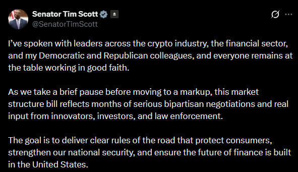 A Szenátus bankbizottságának elnöke, Tim Scott csütörtökön bejelentette, hogy a digitáliseszköz-piacról szóló törvényjavaslat tárgyalását elhalasztották. Eredetileg ma tartották volna.
